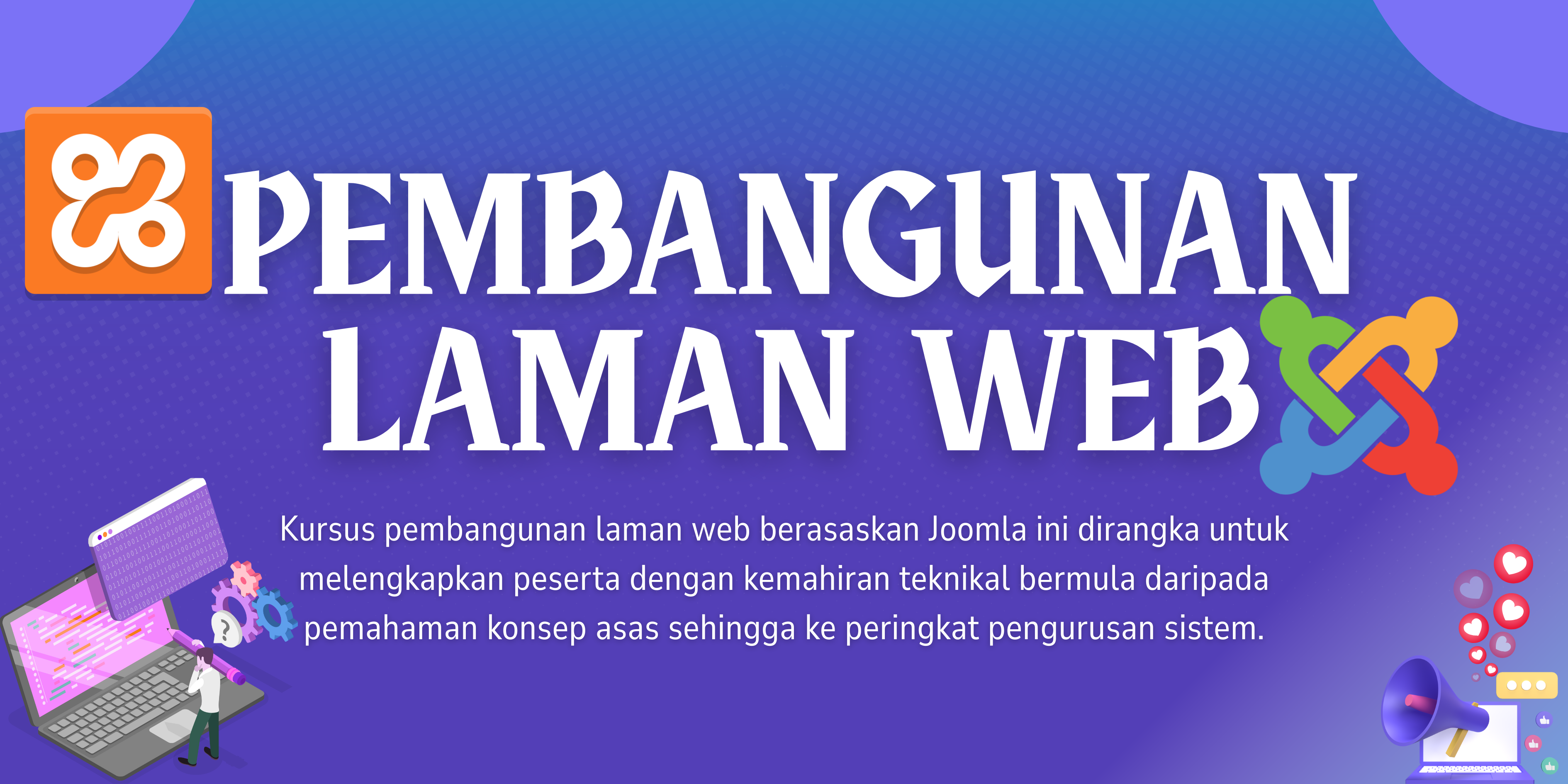 Kursus pembangunan laman web berasaskan Joomla ini dirangka untuk melengkapkan peserta dengan kemahiran teknikal yang menyeluruh, bermula daripada pemahaman konsep asas sehingga ke peringkat pengurusan sistem. Pada peringkat awal, peserta akan didedahkan kepada pengenalan asas laman web, merangkumi definisi penting seperti fungsi domain, pengehosan (hosting), dan pelayan, yang menjadi tulang belakang keberadaan sesebuah laman di internet. Seterusnya, modul ini beralih kepada pengenalan CMS Joomla, sebuah platform Sumber Terbuka yang membolehkan pembinaan laman web dinamik dilakukan tanpa memerlukan kemahiran pengaturcaraan yang kompleks, dengan membezakan fungsi antara paparan pengguna (frontend) dan panel pentadbir (backend).